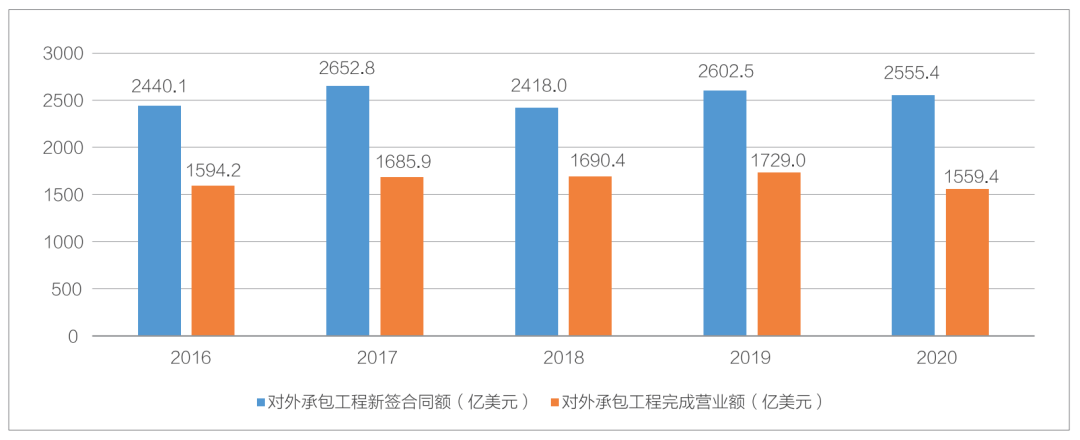 “十三五”期間,我國對外承包工程新簽合同額和完成營業額均呈現出先緩慢上升后下降的態勢。其中,新簽合同額在2017年達到峰值2652.8億美元,完成營業額在2019年達到峰值1729.0億美元。總體來看,近年我國對外承包工程增長乏力。究其原因,一是新冠肺炎疫情對工程建設的負面影響持續不斷;二是民粹主義和逆全球化思潮沖擊國際商務合作;三是我國對外承包工程主要市場以亞洲和非洲地區為主,一些地區政局不穩,經濟復蘇緩慢。